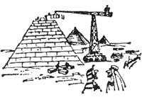 Кроме того, каждый египтянин считал своим естественным долгом и делом чести участвовать в сооружении пирамиды для фараона. Ведь всякий, кто вносил свою лепту в выполнение этой грандиозной задачи, надеялся, что и его коснется частица бессмертия богоподобного фараона. Поэтому в конце июня нескончаемые потоки крестьян устремлялись в Гизу. Там их размещали во временных бараках и объединяли в группы по восемь человек. Можно было начинать работу. Переплыв на лодках на другой берег Нила, мужчины направлялись в каменоломню. Там они вырубали каменную глыбу, обтесывали ее с помощью кувалд, клиньев, пил и буравов и получали блок нужных размеров - со сторонами от 80 см до 1,45 м. Используя канаты и рычаги, каждая группа устанавливала свой блок на деревянные полозья и на них по бревенчатому настилу перетаскивала его к берегу Нила. Парусная лодка переправляла рабочих и блок весом до 7,5 тонн на другой берег.