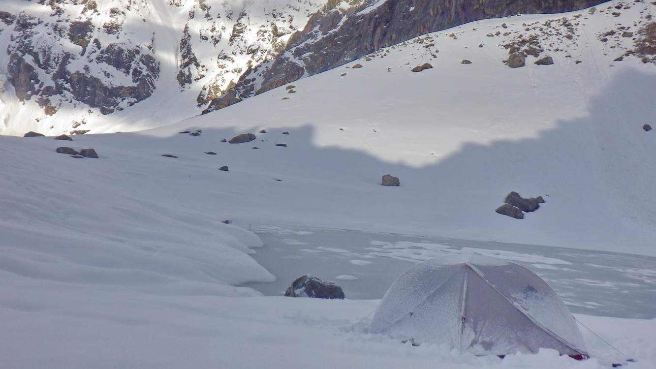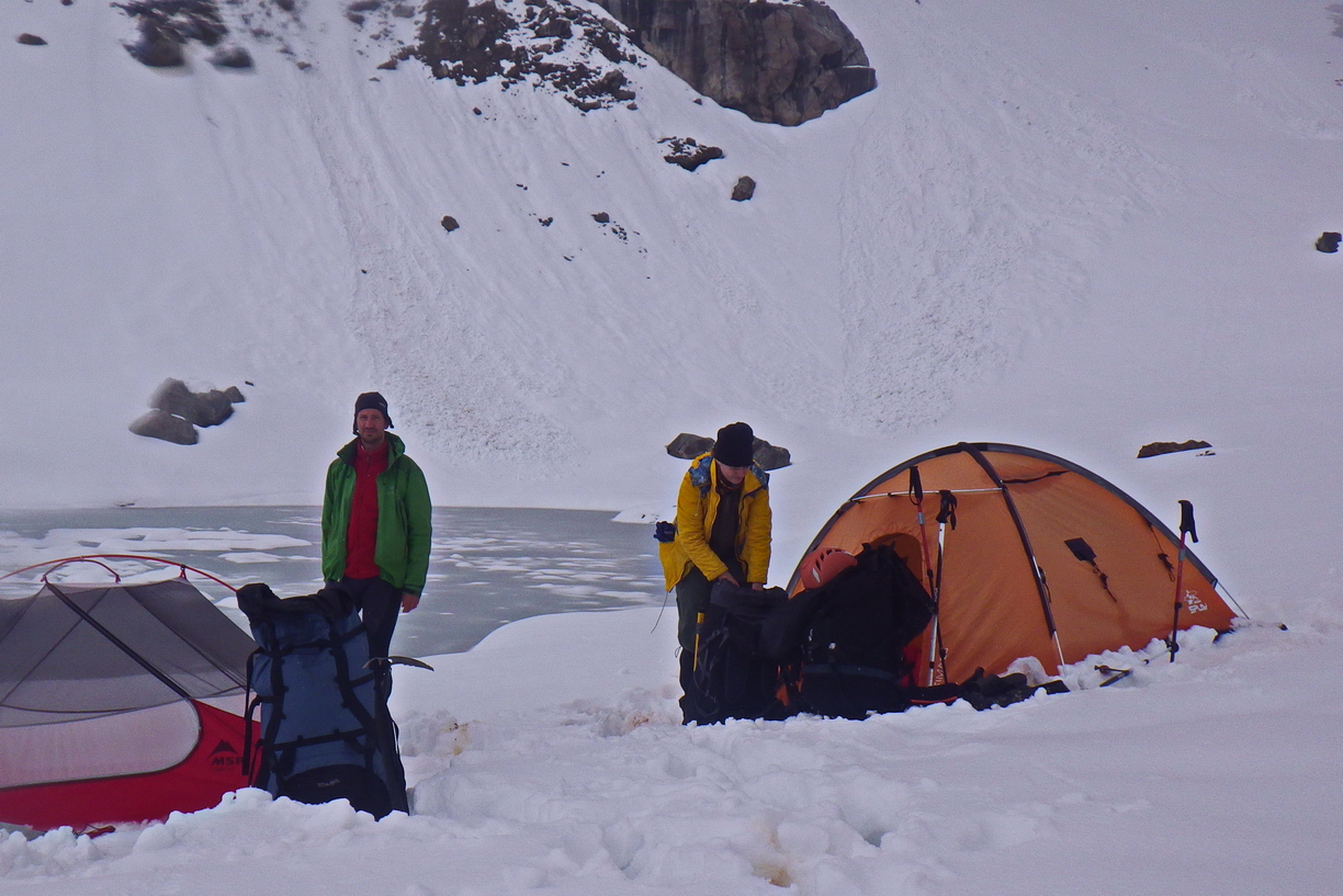 Просто снег и низкие температуры палатке не страшны. Ставится так же хорошо, к тому же благодаря размерам её легче похоронить закопать или прикрыть ветрозащитной стенкой. У нас снежное строительство не требовалось, но на снегу ночевать приходилось.