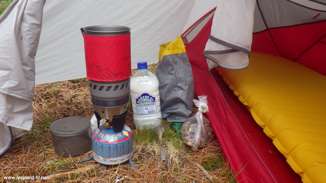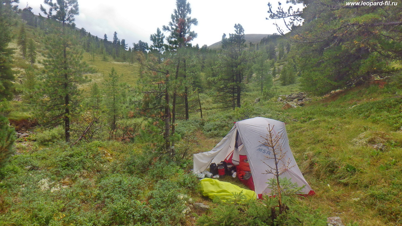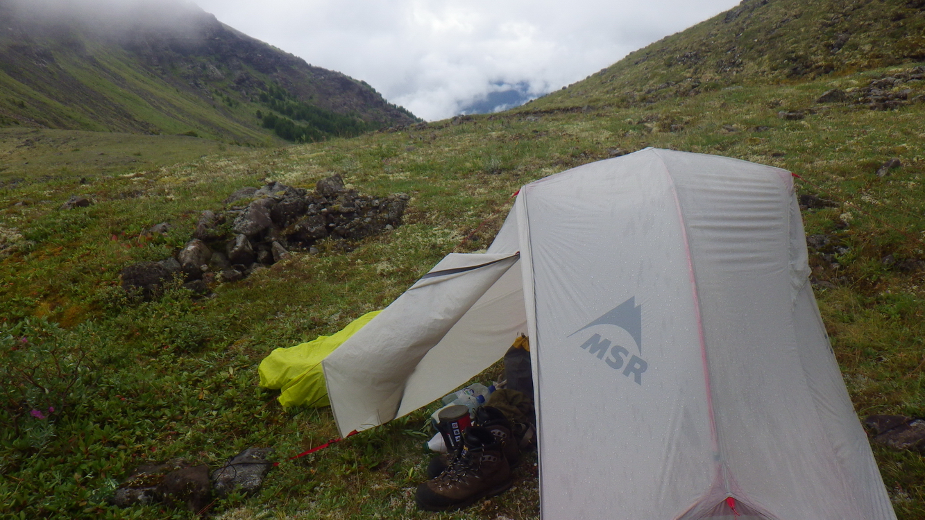 Но, это всё маркетинговая теория и фигня. А на Хамар-Дабане каждый день шли дожди. Так вот - сильный дождь палатка держит. Ливень стеной - нет. Протекало понемногу сверху маленького тамбура, от короткой дуги. Половина из того, что протекало, попадало во внутреннюю палатку, через сетку. Естественно, только на спальный мешок. Сильные ливни в палатке я пересиживал дважды, оба раза протекло.