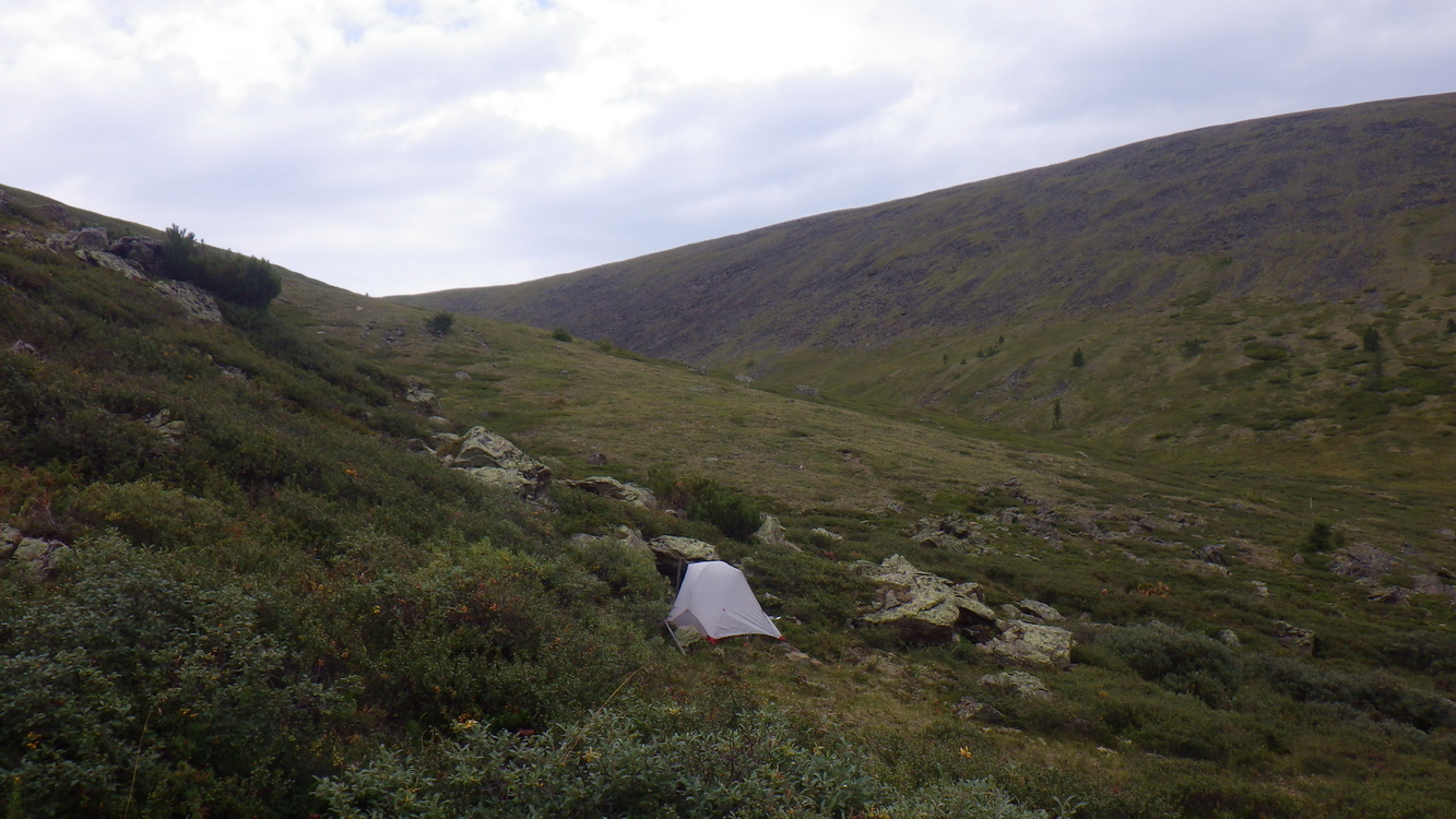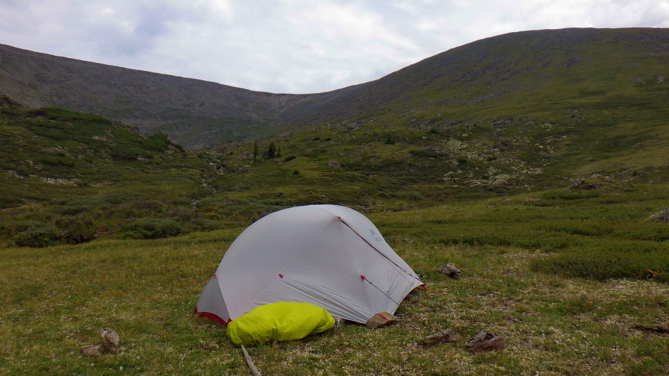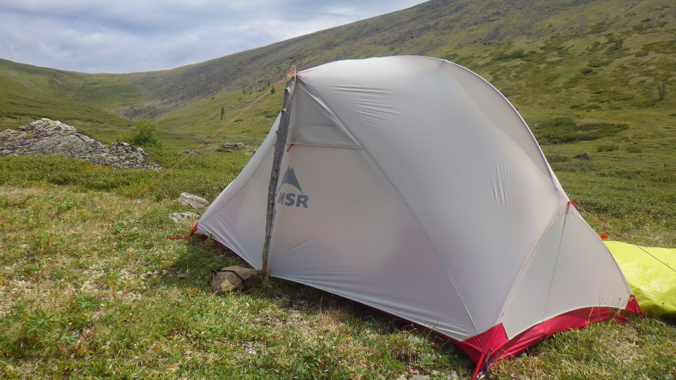 Палатка имеет никакую ветроустойчивость, если ветер боковой. Хоть как-то стоит только в том случае, если ветер дует вдоль. Каждая моя ночёвка выше зоны леса на Хамар-Дабане была связана с риском.