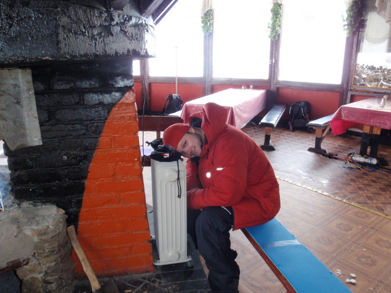 Добравшись до нашей хижины мы увидели удручающую картину, окно выбито ветром, дверь завалена снегом. Вся хижина в снегу... Что делать, начали откапывать и убирать снег внутри. Окно забили ковриком-карематом, почистили от снега помещение, на сколько это было возможно. Температура внутри -12 градусов, веселье продолжается. Выпили чайку, немного согрелись, отдышались и пошли дальше набирать высоту для акклиматизации. Нужно набрать еще 200 метров, хорошо хоть на легке без рюкзаков.